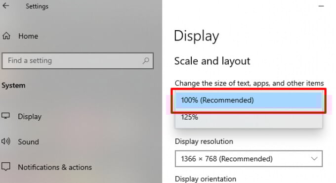 Se a escala de exibição do seu computador já estiver definida para 100%, tente alterá-la para 125% e, em seguida, volte para 100%.