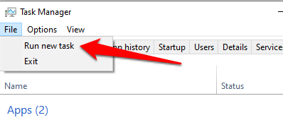 Reinicie o Explorador de Arquivos clicando no ícone da pasta na barra de tarefas. Como alternativa, use o Gerenciador de Tarefas: Clique em um arquivo na barra de menus e selecione Execute uma nova missão.
