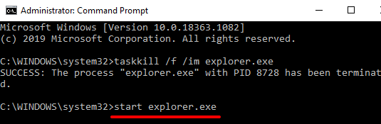 A barra de tarefas e os ícones da área de trabalho do seu computador desaparecerão ao fechar o Explorador de Arquivos do Windows. Isso é normal e temporário. Para reiniciar o Explorador de Arquivos, digite iniciar explorer.exe na janela do prompt de comando e pressione Entrar seguir.