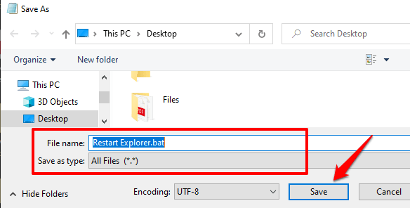 - Na caixa de diálogo Nome do arquivo, renomeie o arquivo para Reinicie o Explorer.bat Certifique-se de que a opção Salvar como tipo Nomeado para Todos os arquivos.