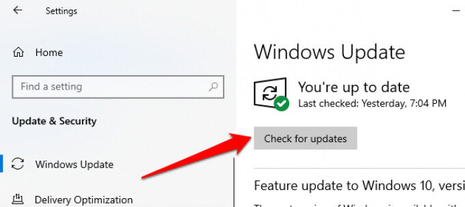 Vamos para الإعدادات > Atualização e segurança > Windows Update E clique Verifique se há atualizações.