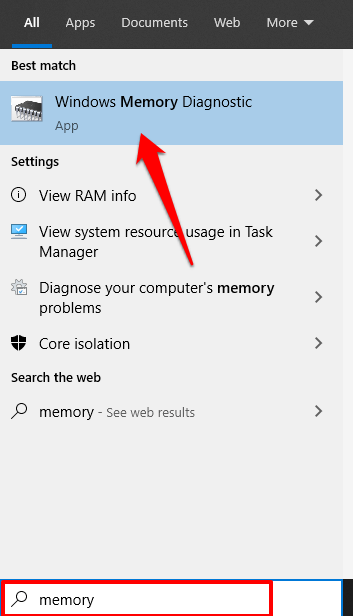 1. Digite memória na barra de pesquisa do Windows e selecione Diagnóstico de Memória do Windows No resultado.