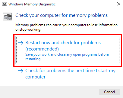 2. Serão apresentadas as duas opções a seguir. Selecione a opção que diz “Reinicie agora e verifique se há problemas (recomendado).".