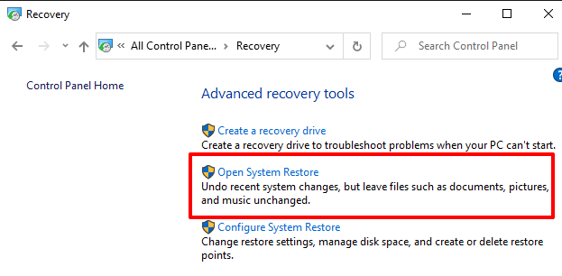 3. Selecione Abra a Restauração do Sistema (Abrir restauração do sistema).