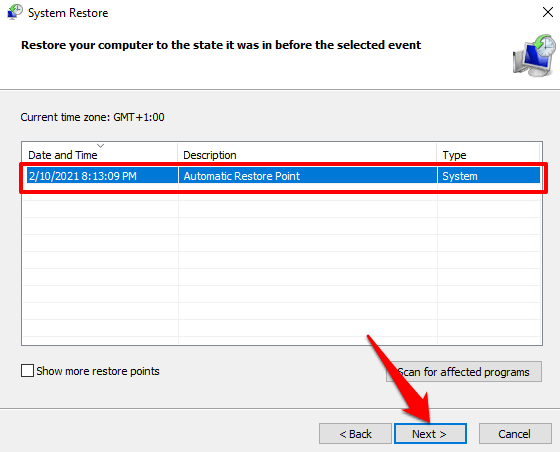 5. O ponto de restauração do sistema mais recente aparecerá na lista. Selecione-o e clique. Seguinte (A seguir) para continuar.